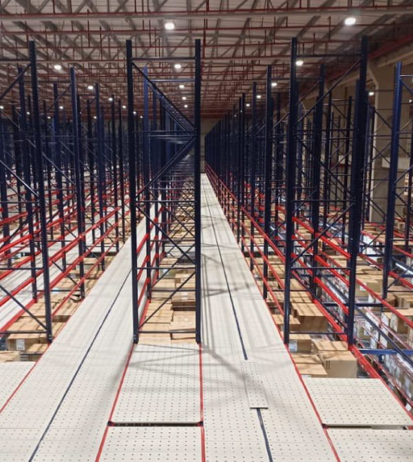 Estantería con entrepiso de 9 m y traslado de 2.200 posiciones